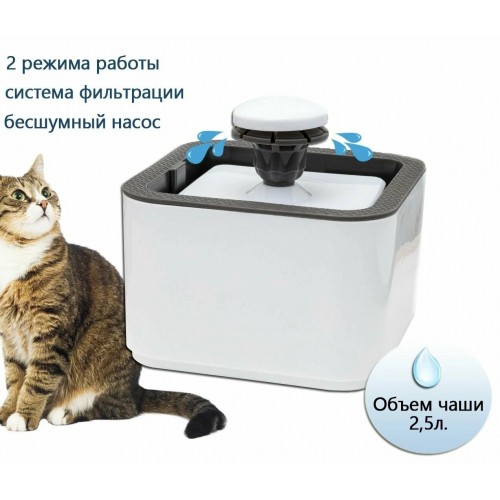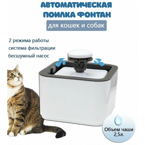 Автоматическая поилка-фонтан PET WATER FOUNTAIN для животных — это удобное и современное устройство, обеспечивающее постоянный доступ кошек и собак к свежей проточной воде. Компактная квадратная форма поилки гармонично впишется в любой интерьер и не займёт много места. Благодаря объёму чаши 2,5 литра, питомцу всегда доступна чистая вода, а встроенный проводной насос с USB-питанием поддерживает мягкое и бесшумное течение, стимулируя животных пить чаще. Фонтан выполнен из прочного, безопасного для здоровья пластика, устойчивого к износу и легко очищающегося. Устройство идеально подходит для использования дома, в квартире или на даче. Простое подключение через USB делает эксплуатацию максимально удобной — достаточно подсоединить кабель к адаптеру или пауэрбанку.